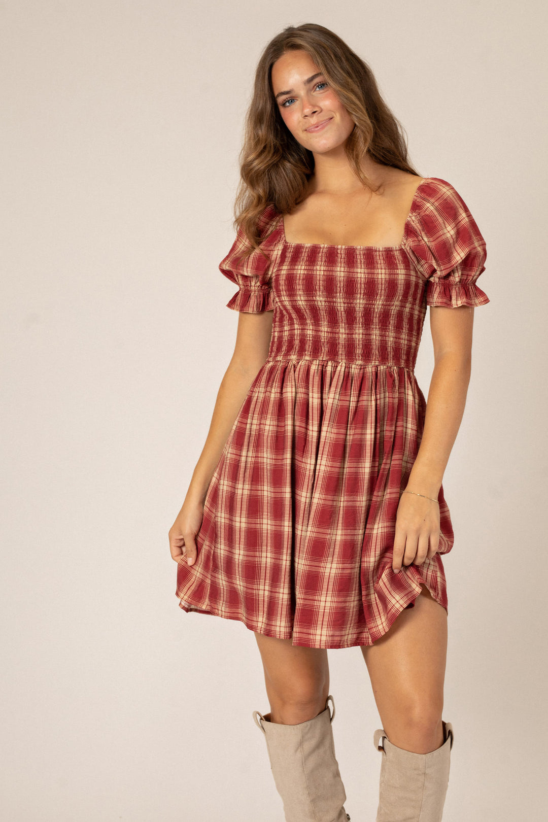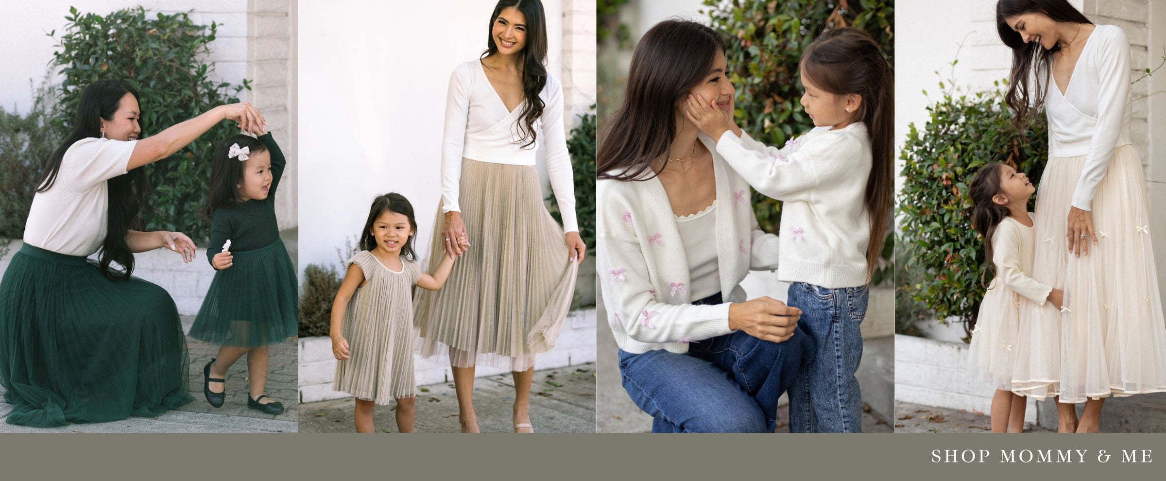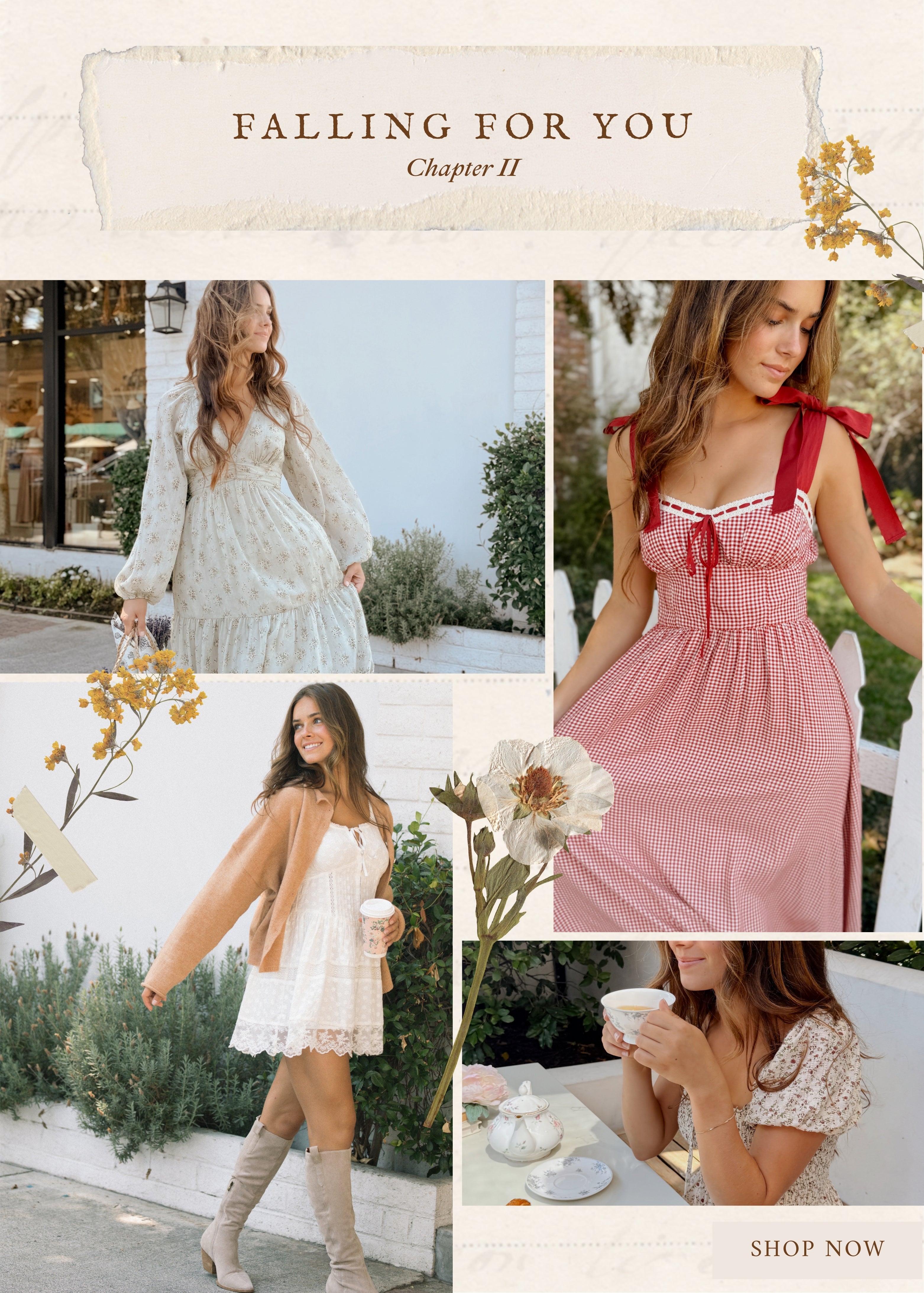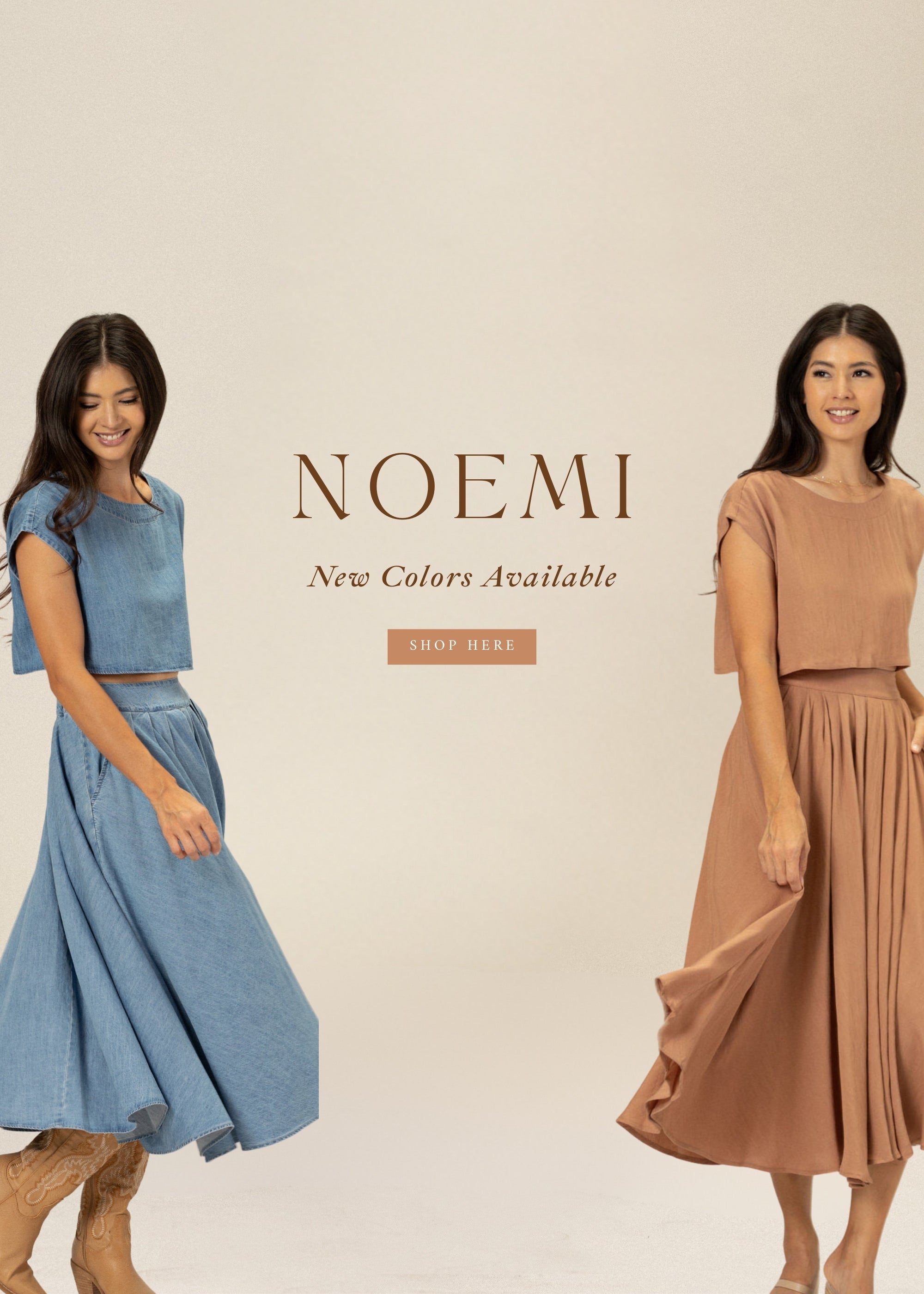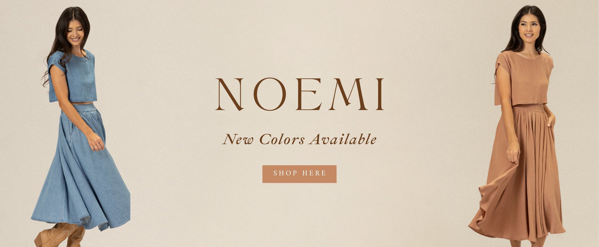 Three women wearing dresses from the brand NOEMI on a beige background.