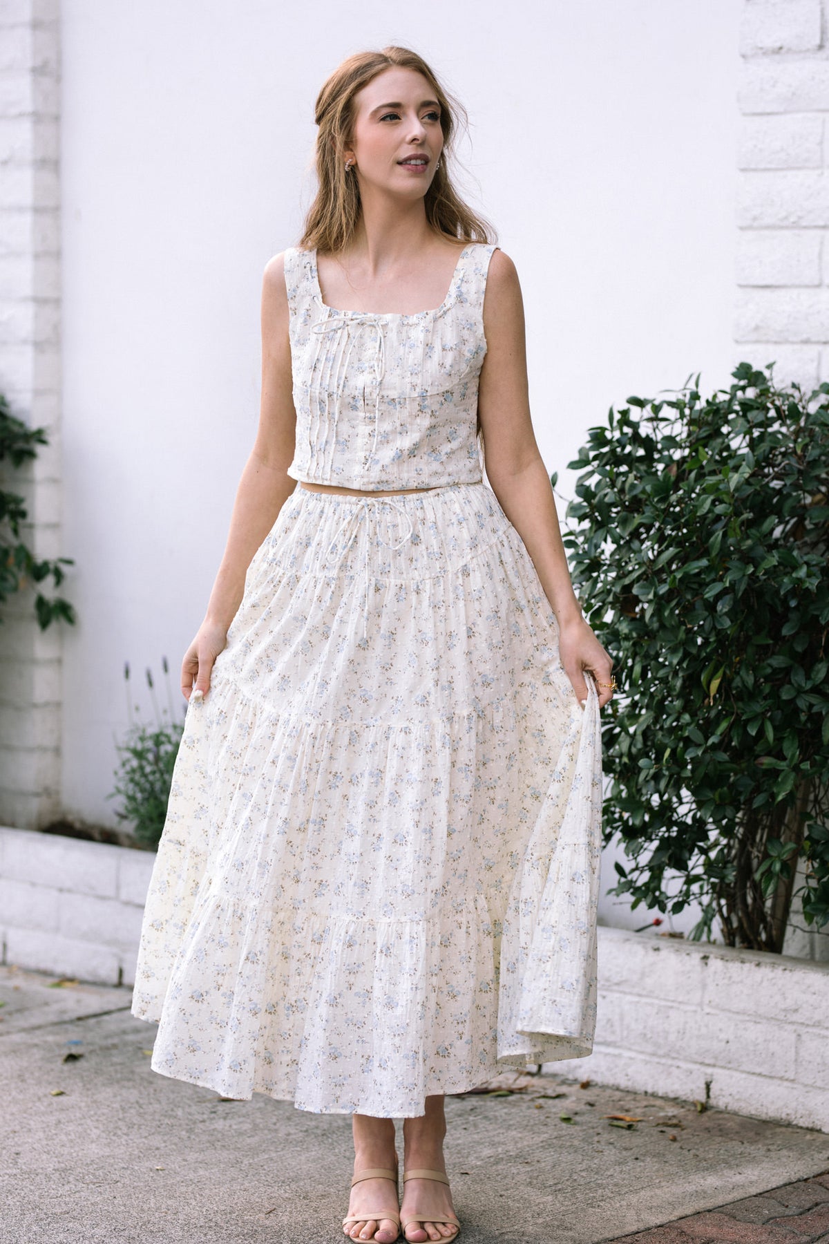 A floral sleeveless crop top with a pleated high-waist maxi skirt in a soft, ivory and blue floral print, featuring a fitted bodice and flowing, tiered skirt.