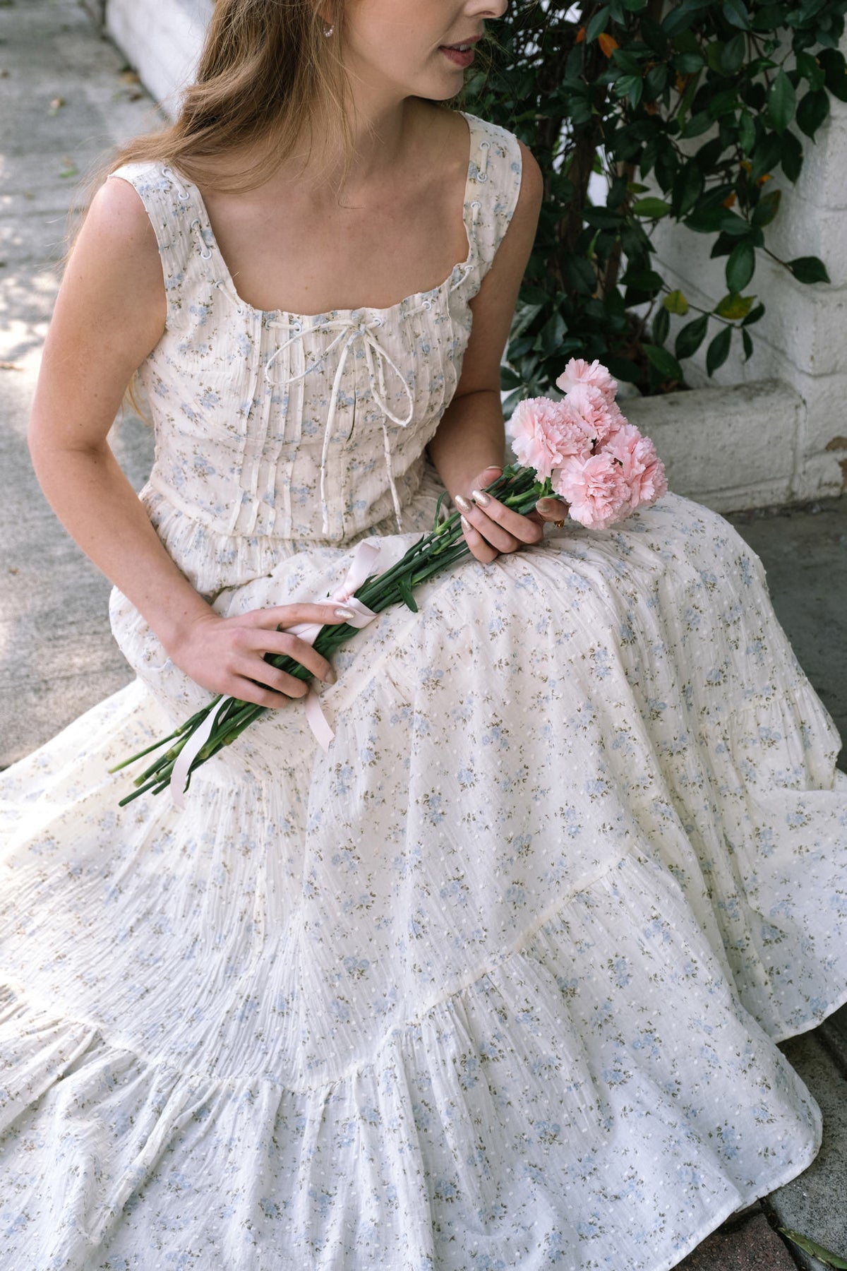 A young woman in a flowing white dress with blue floral print, holding a bouquet of pink peonies, standing against a background of lush greenery.