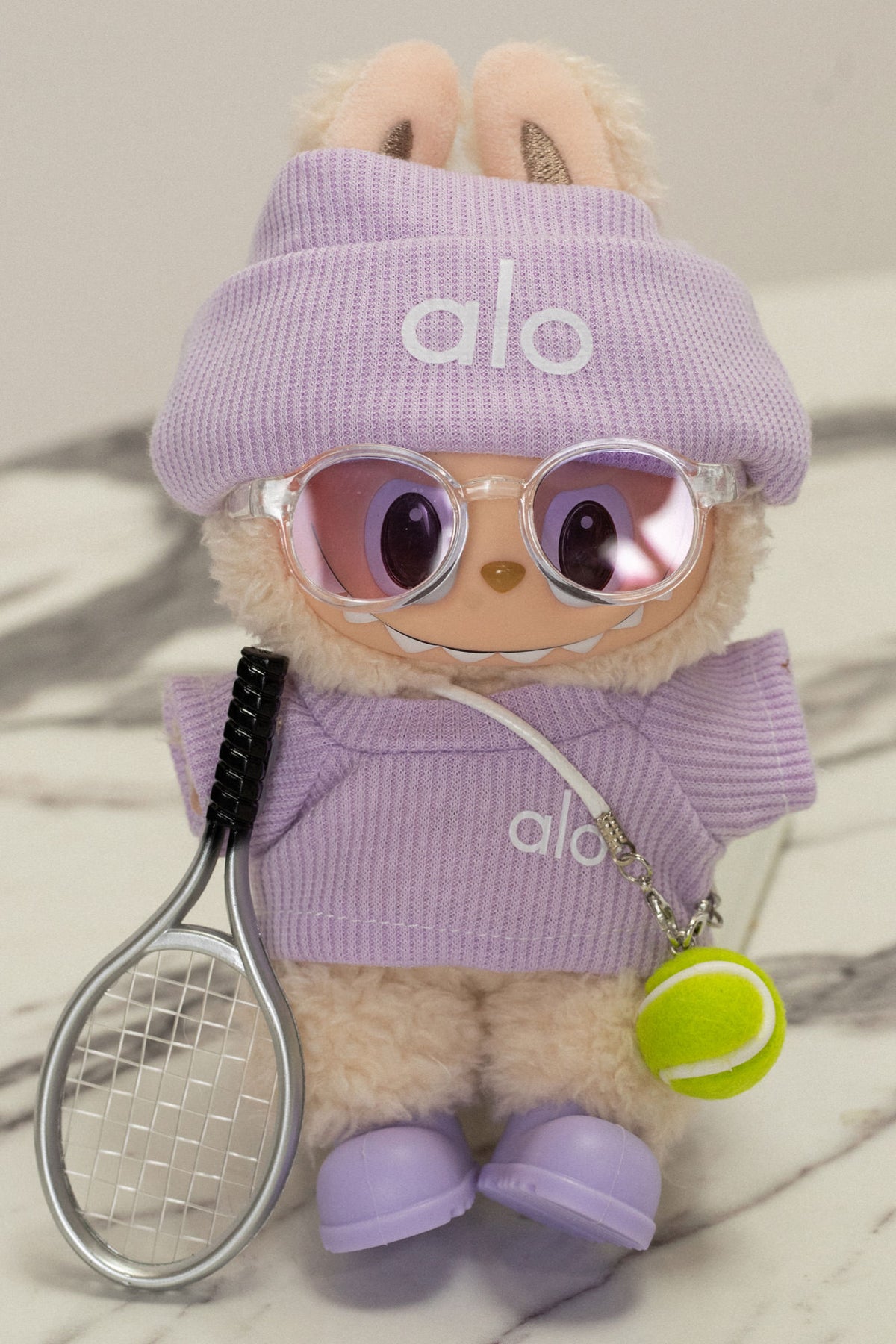 Plush tennis-themed stuffed animal wearing a lavender outfit with Alo logo, holding a tennis racket and ball.