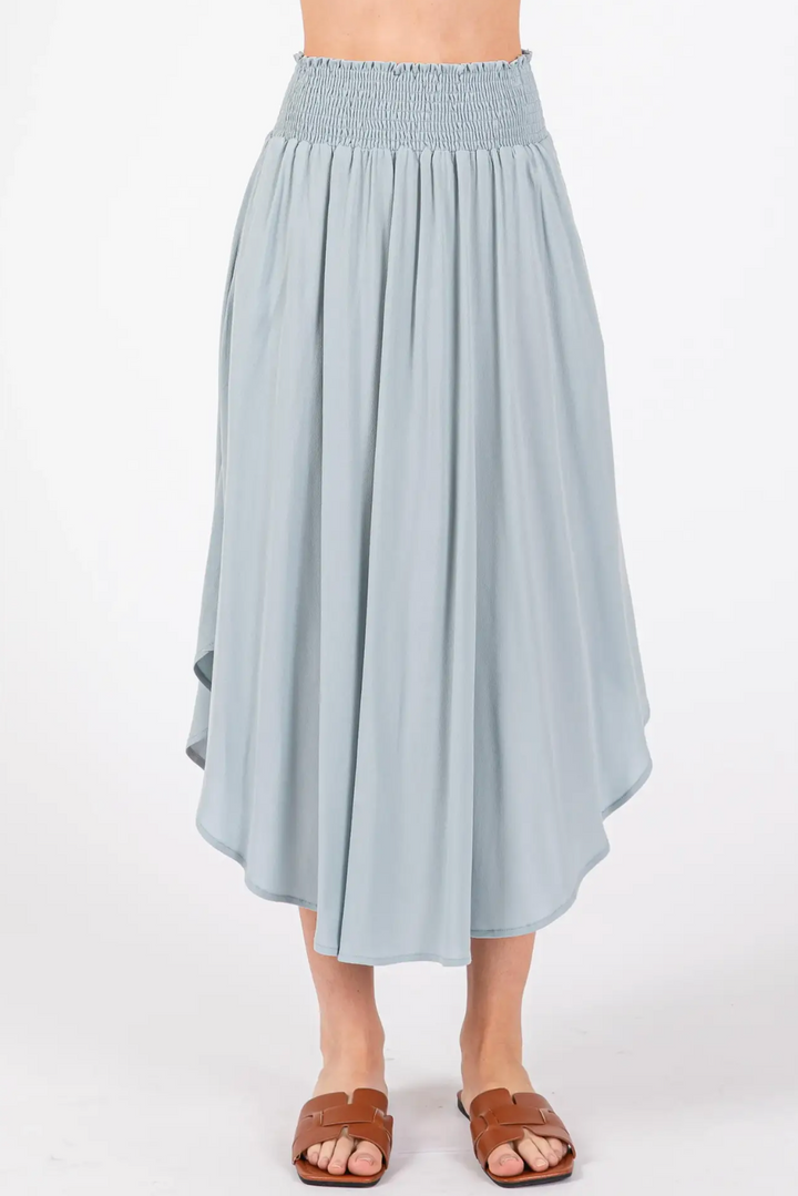 This fluid, mid-length skirt in a muted blue-gray hue features a high-waisted, elasticized smocking detail and a flowy, round hemline that complements the natural movement of the fabric.