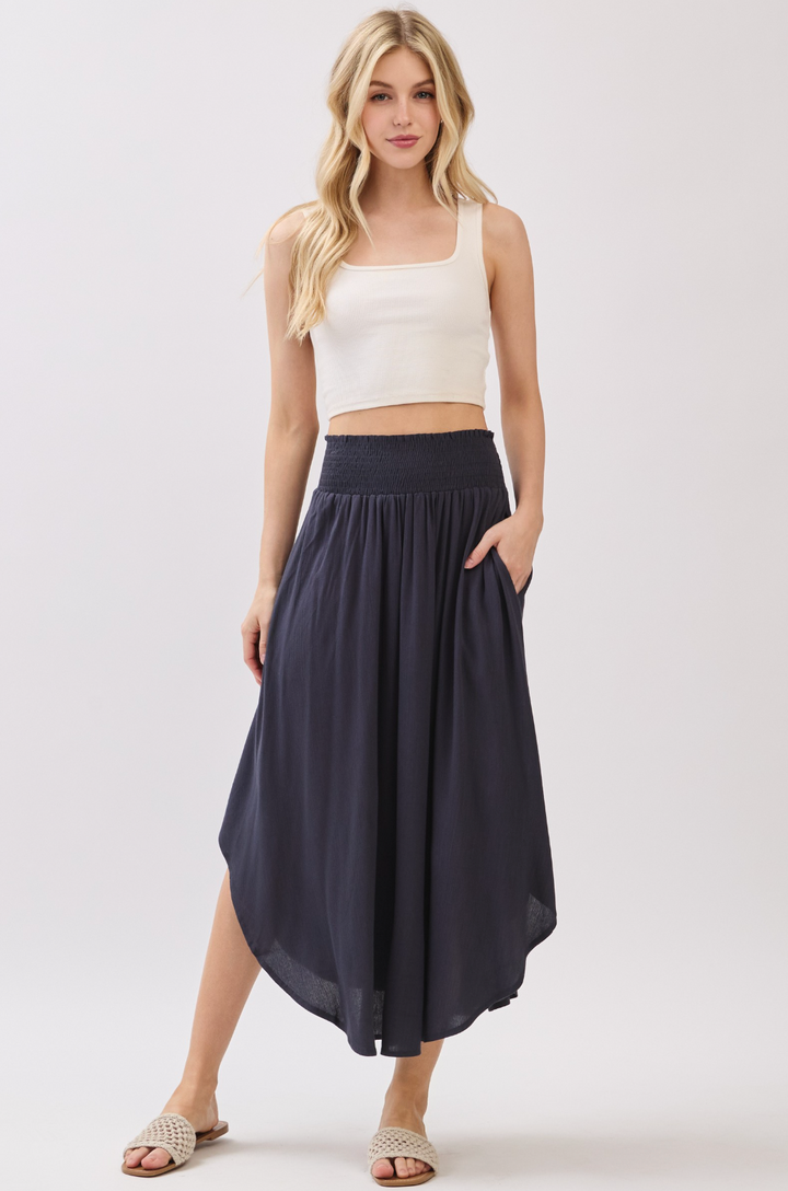 A flowing, navy blue midi skirt with a round hemline and a high, smocked waistband.