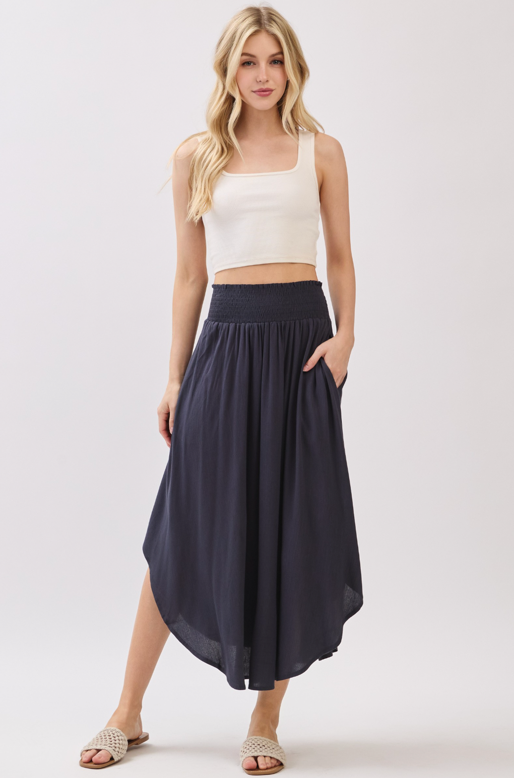 A young woman with long, wavy blonde hair wearing a white tank top and a flowing, dark blue midi skirt with an elastic waistband and a round hemline.