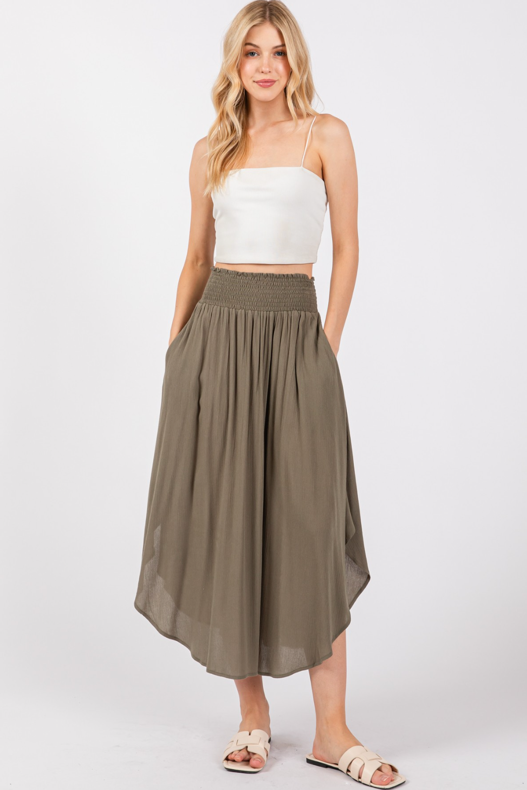A light olive green midi skirt with a smocked waistband and a flowy, round hemline. The skirt has pockets and is paired with nude sandals.