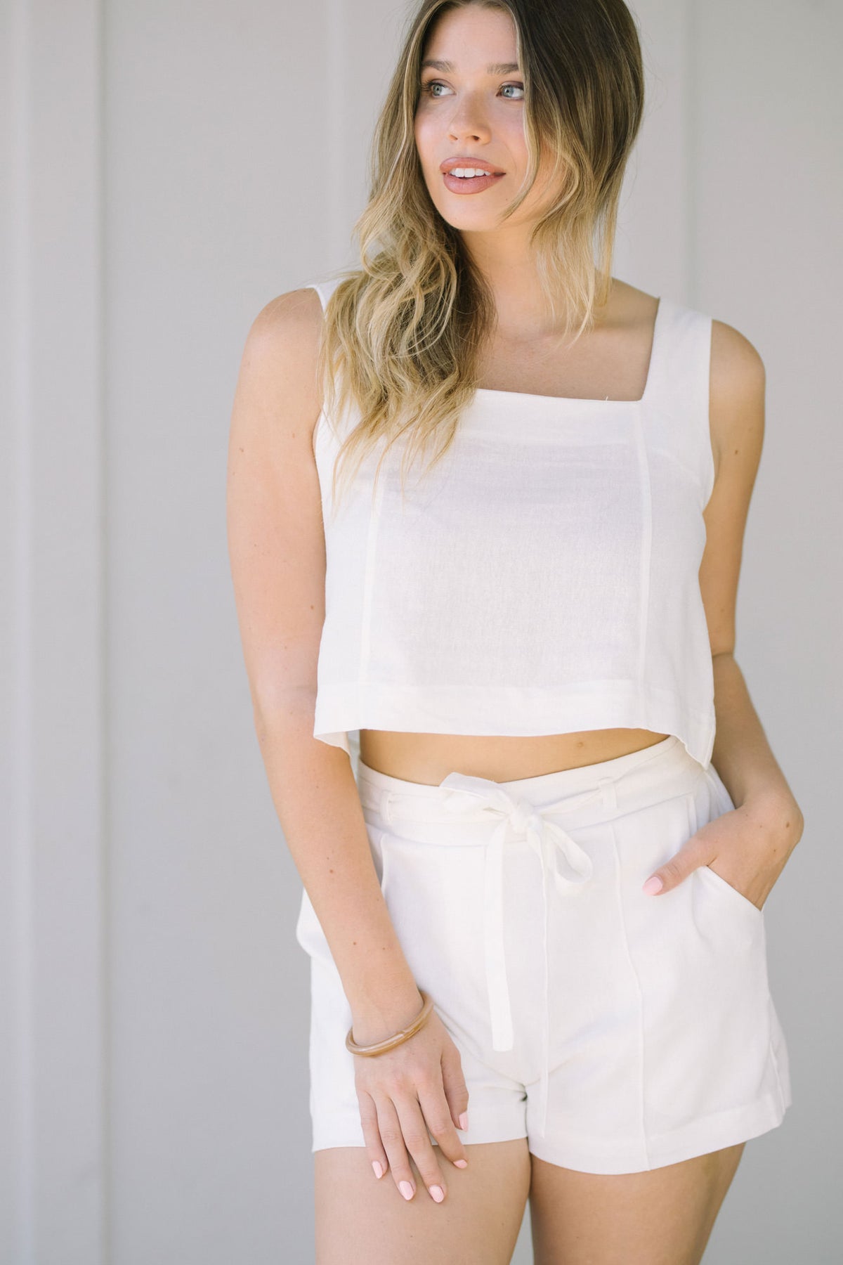 Woman wearing a white square-neck tank top and high-waisted white shorts, with blonde wavy hair and a natural makeup look.