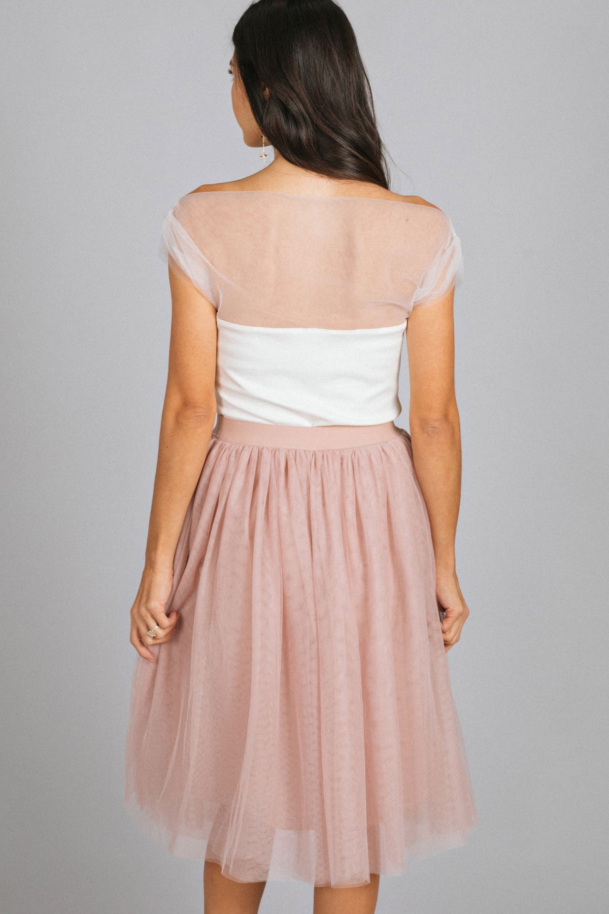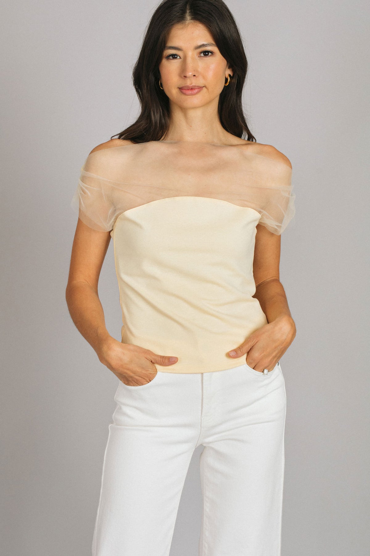 • Flattering off-shoulder silhouette that elegantly frames the collarbones and shoulders for a romantic look