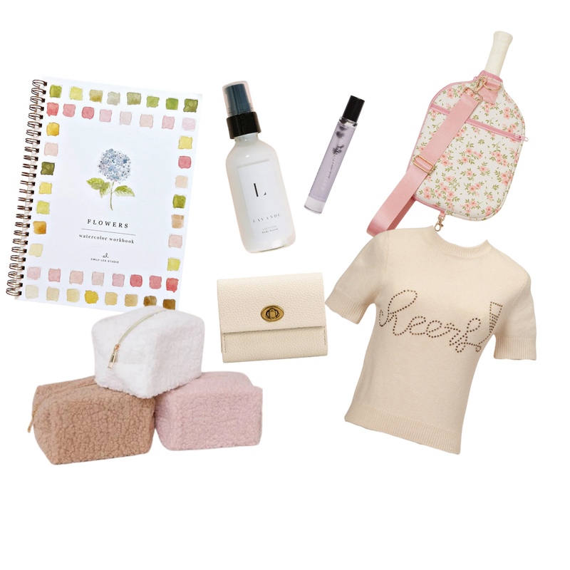 Cute sweaters & outerwear, makeup bags & wallets, classic jewelry, self-care & beauty, journals