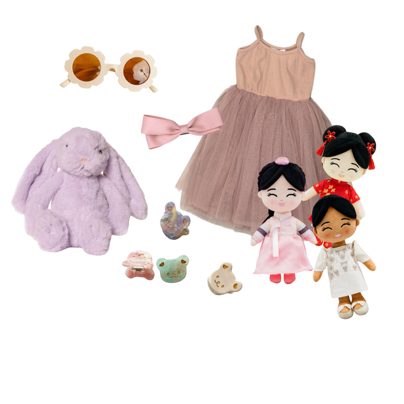 Tulle skirts & soft dresses, hair bows & headbands, stuffed animals & dolls, storybooks & art sets
