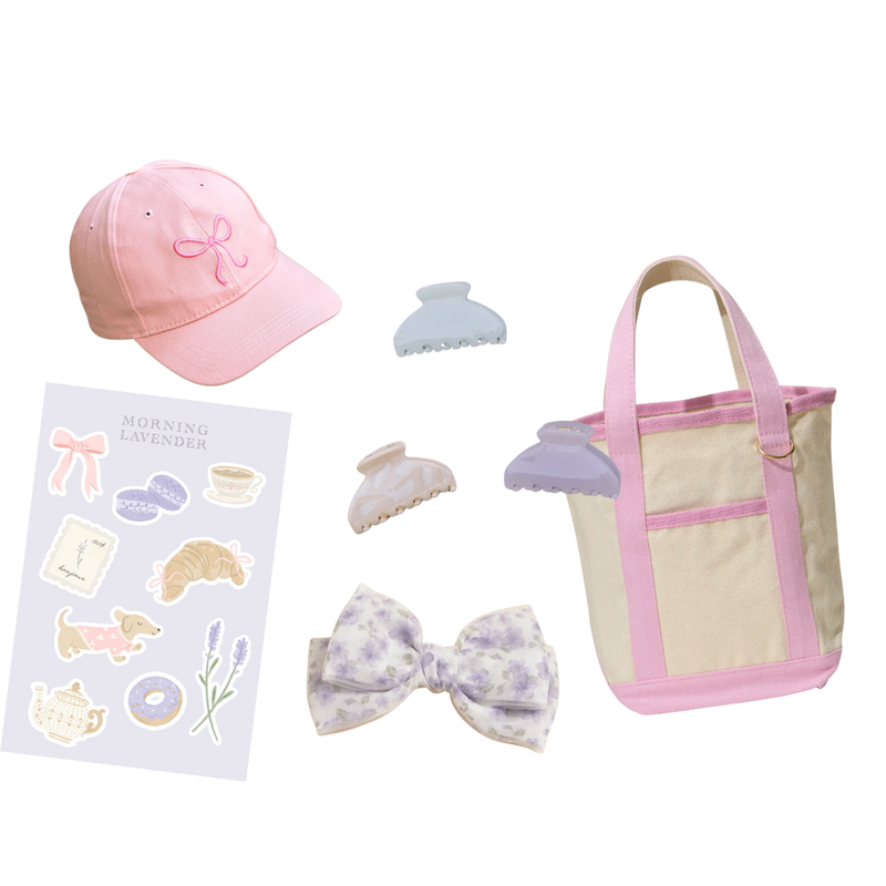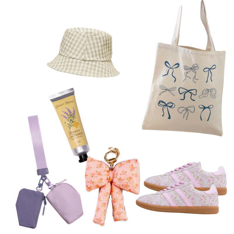 Fun sneakers, lip gloss or skincare, hats & hair accessories, wristlets & bag charms, graphic totes