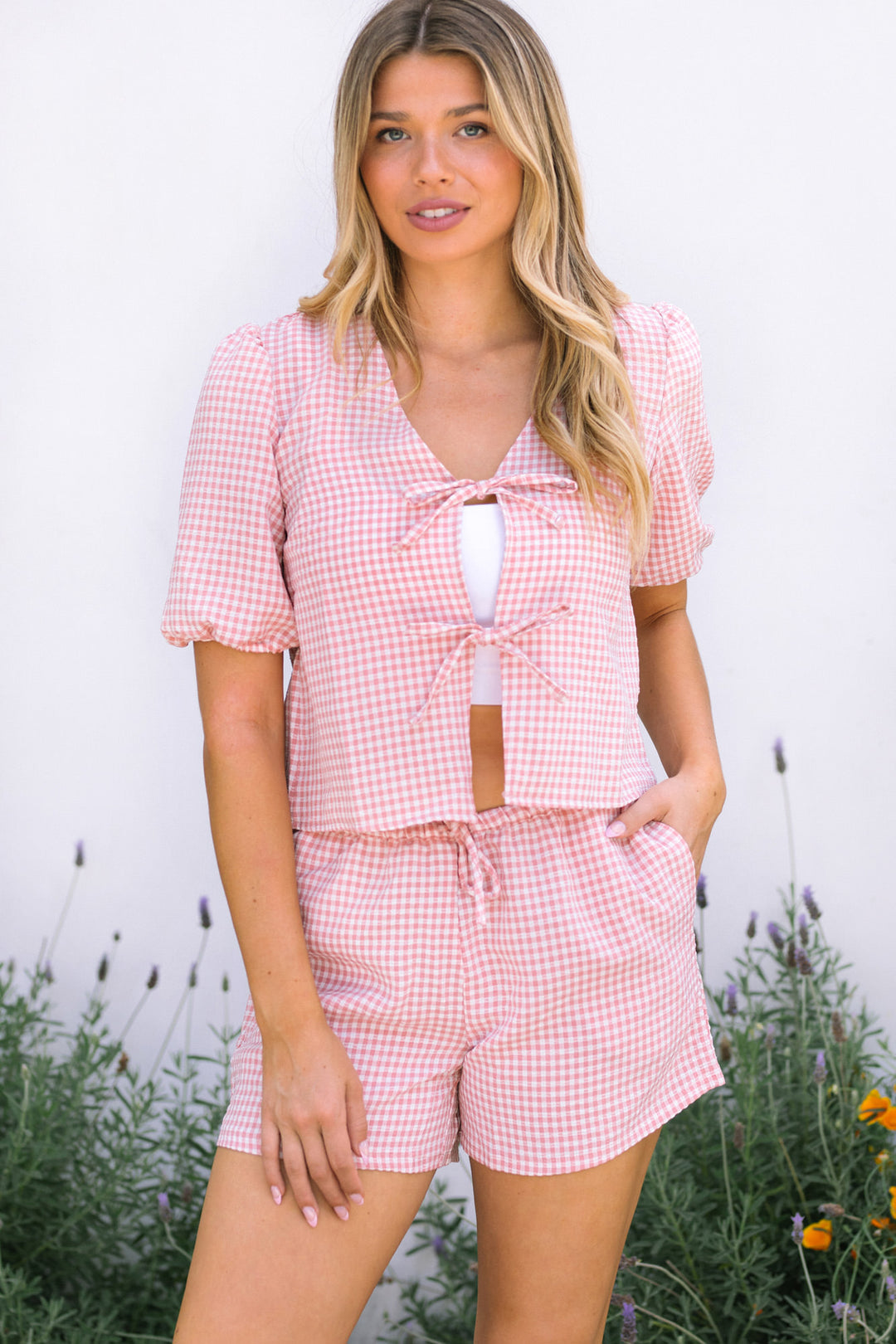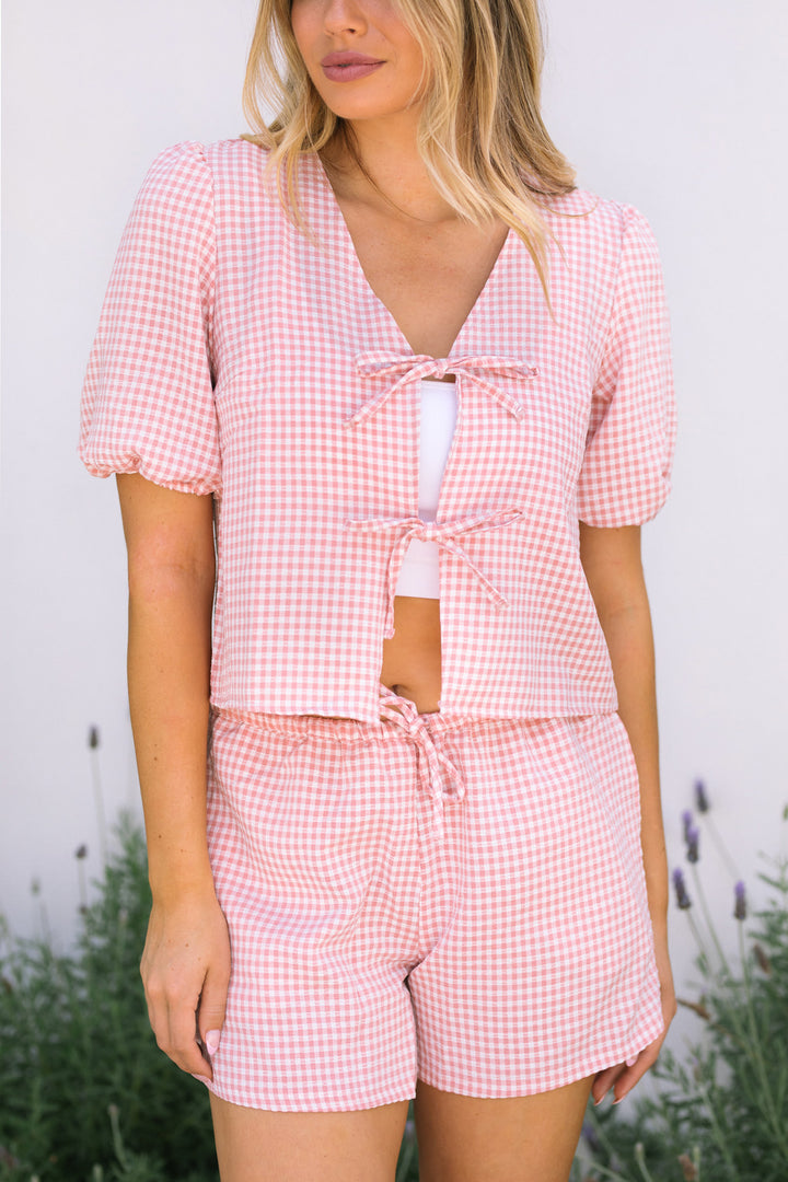 Lightweight pink and white checkered gingham shorts with puffed sleeves, a tie-front waist, and an elastic waistband.
