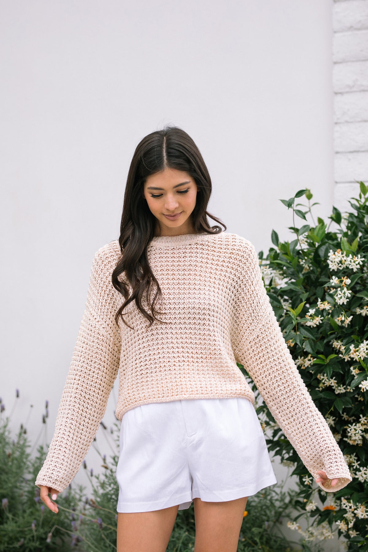 A light pink crochet knit sweater with a classic round neckline, loose fit, and long sleeves, shown with white shorts against a garden backdrop.