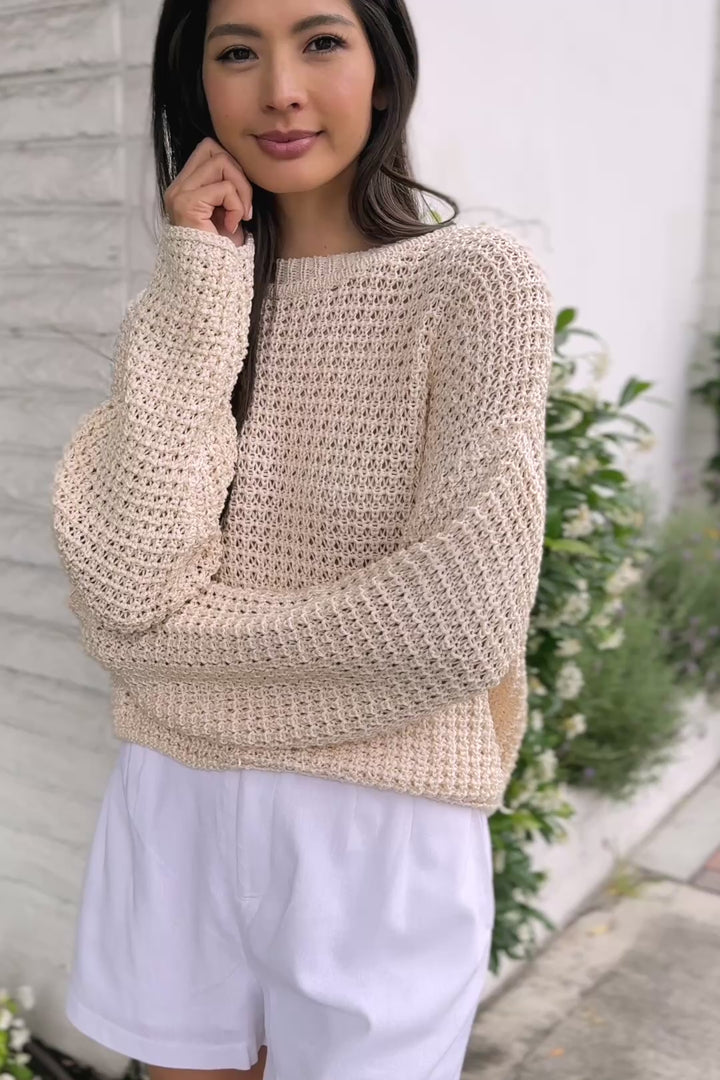 Beige crochet knit sweater with a classic round neckline, showcasing a relaxed, cozy design.