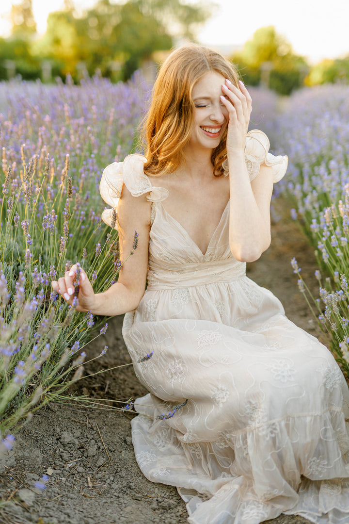 A woman stands in a lavender field wearing a flowing, ivory-colored dress with floral embroidery and ruffled sleeves.