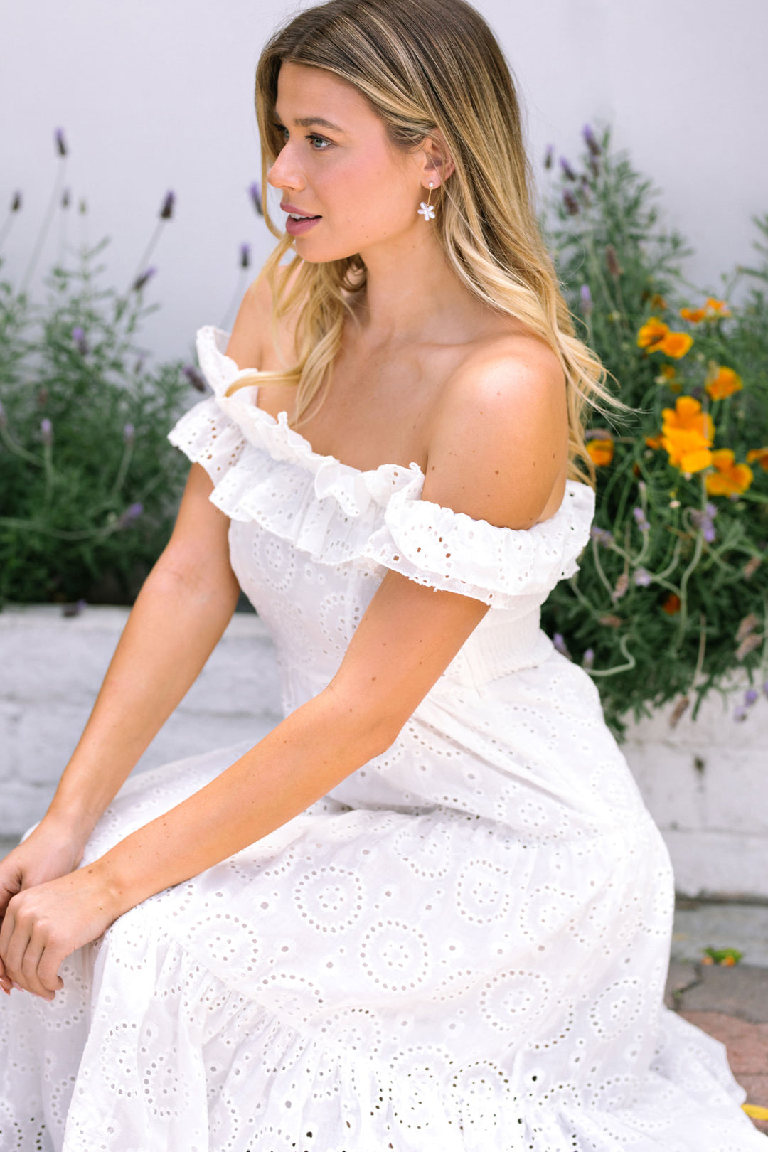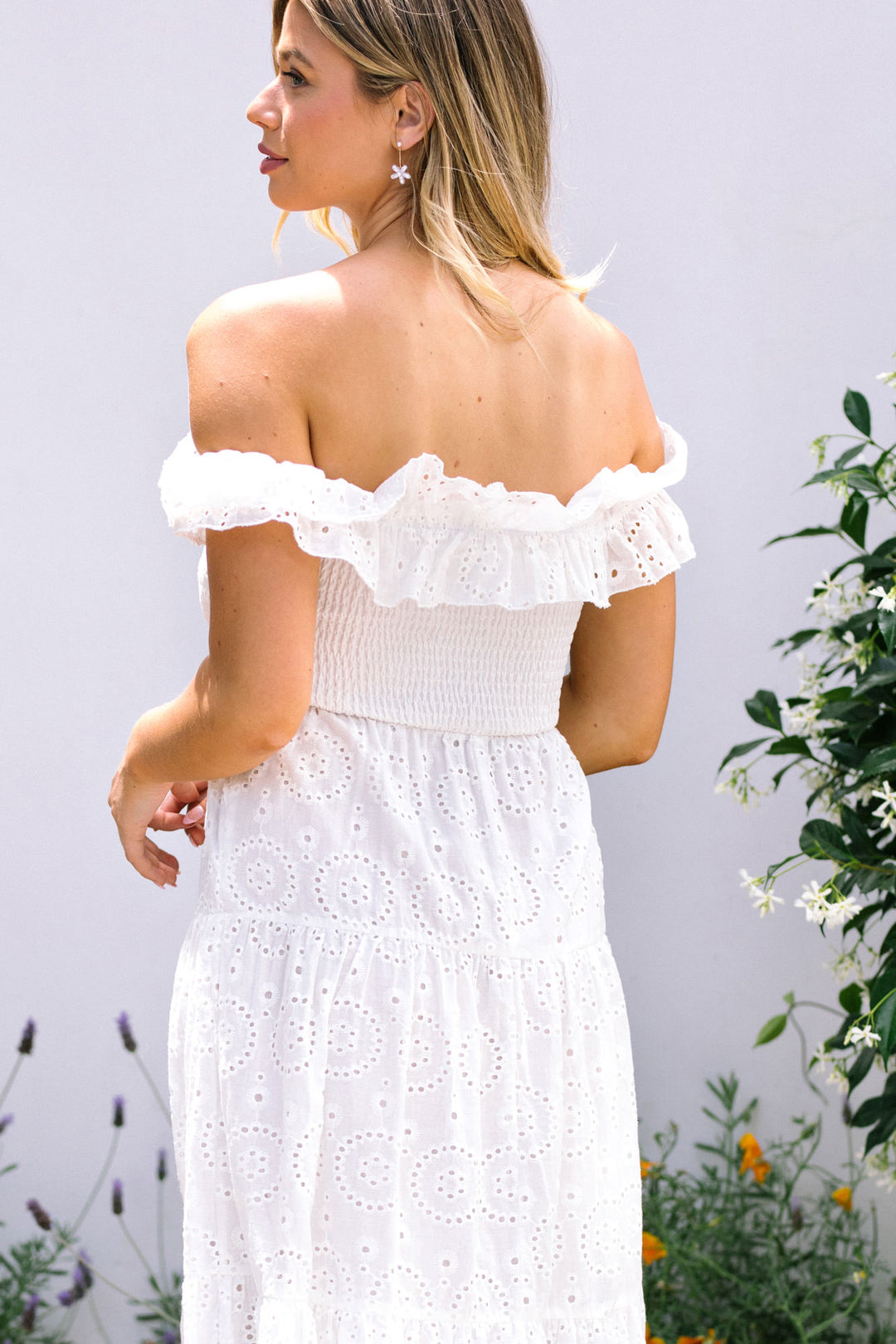 A white off-the-shoulder dress with eyelet embroidery, a smocked bodice, and a flowing, tiered skirt.