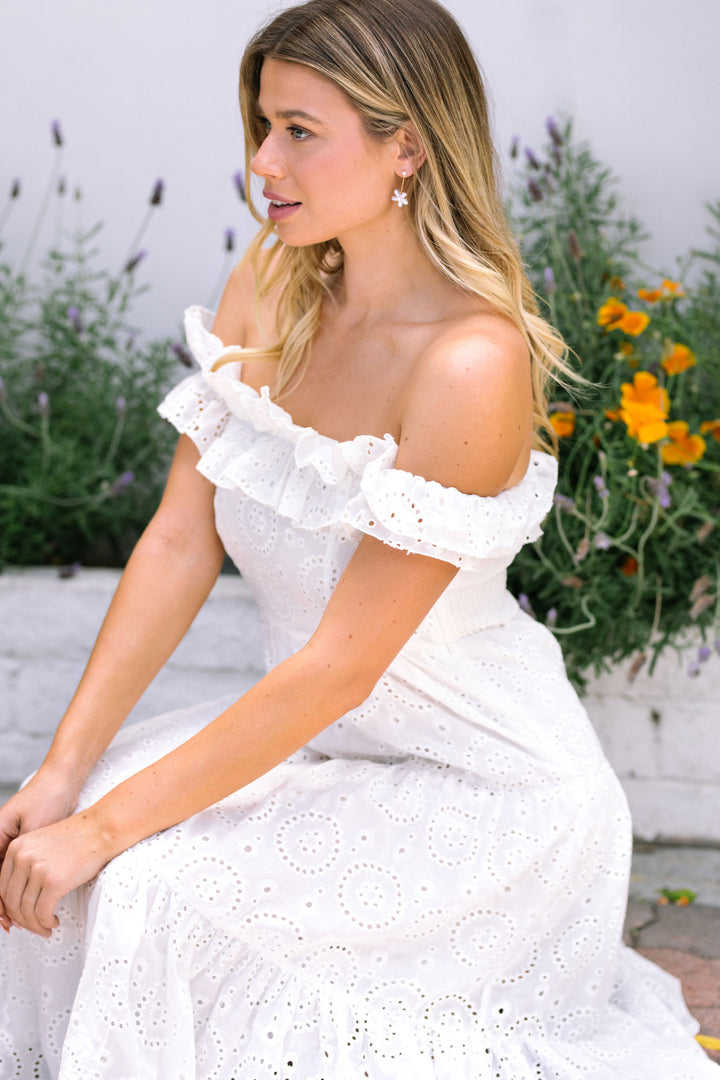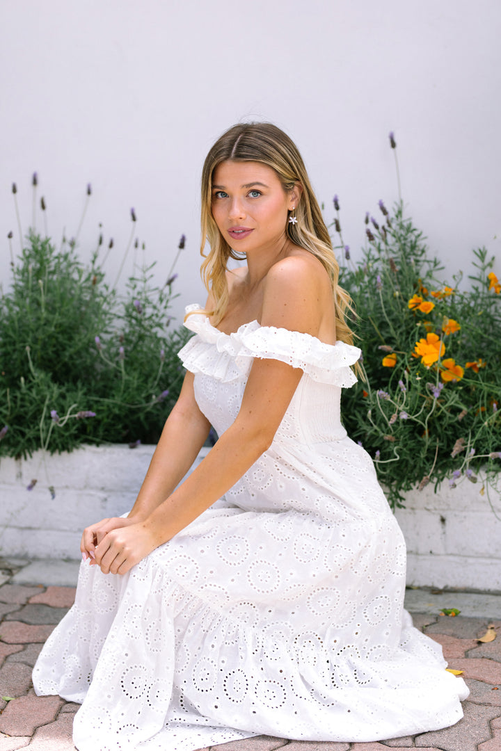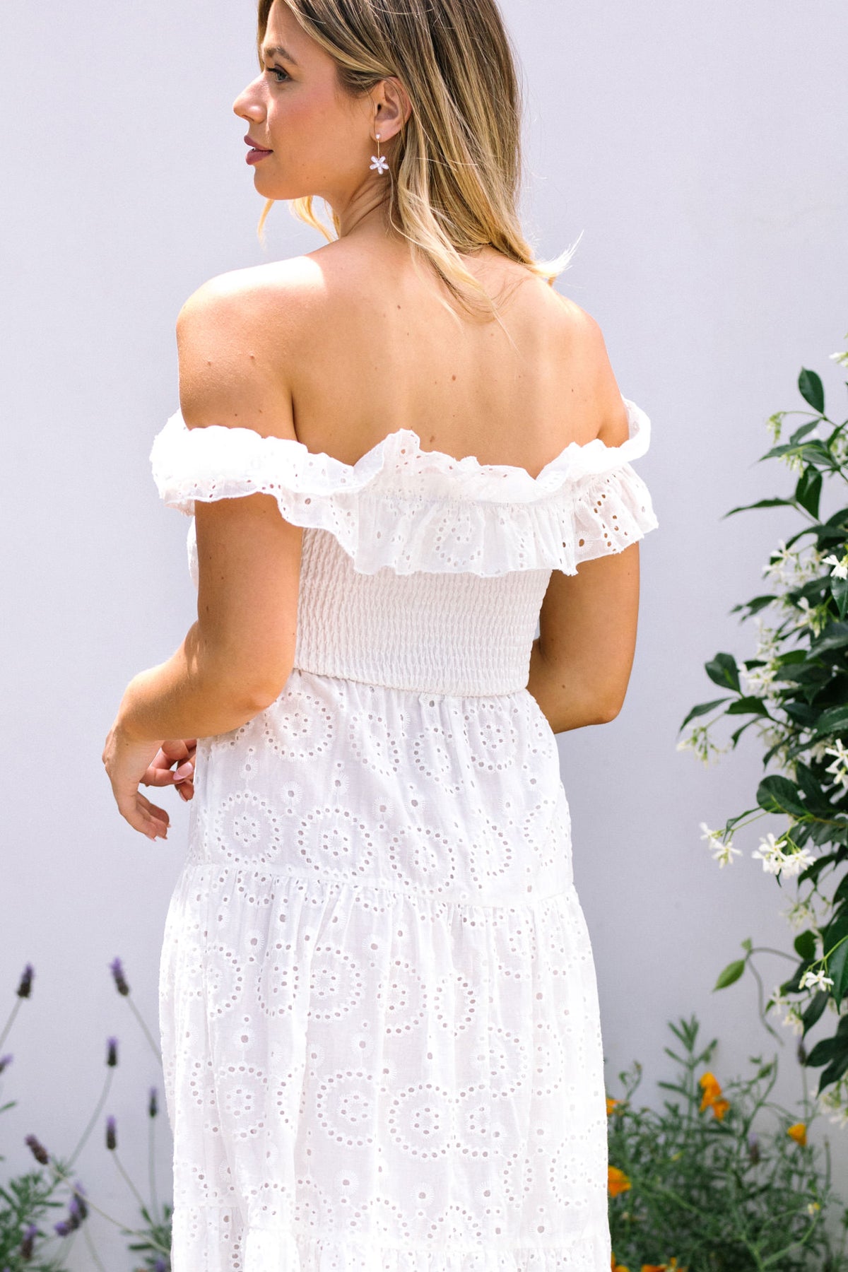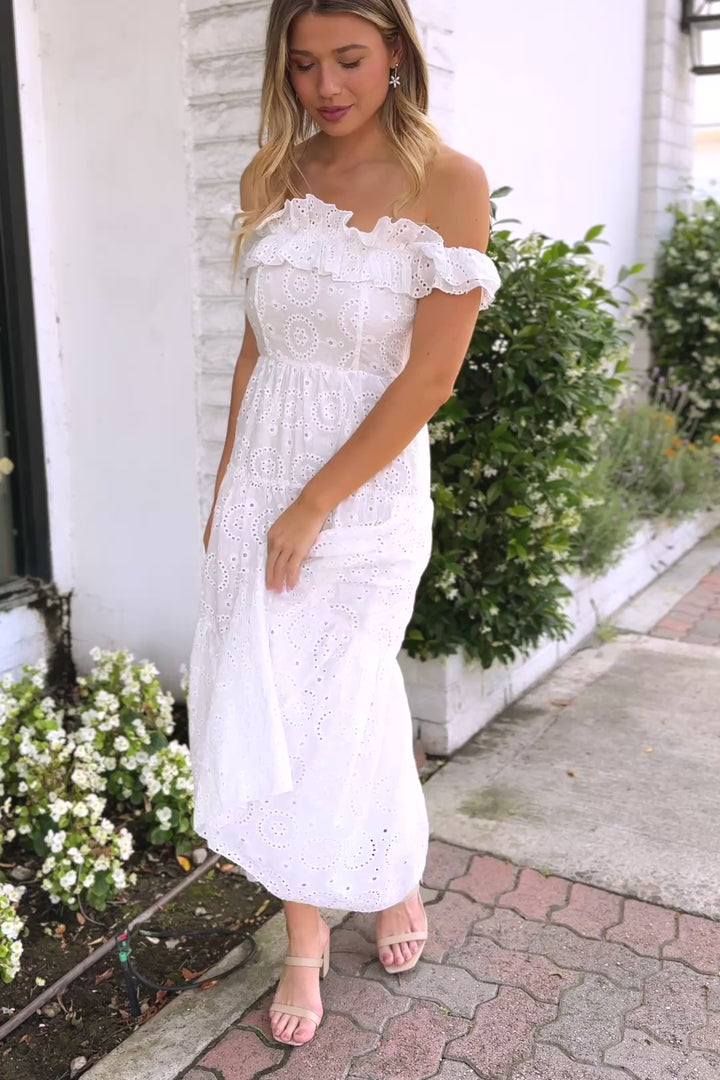 A white off-the-shoulder midi dress with an eyelet embroidered pattern, accentuated waistline, and cascading ruffle details.