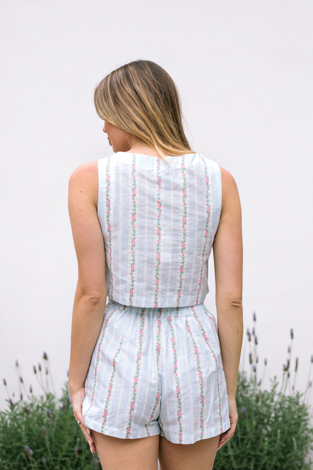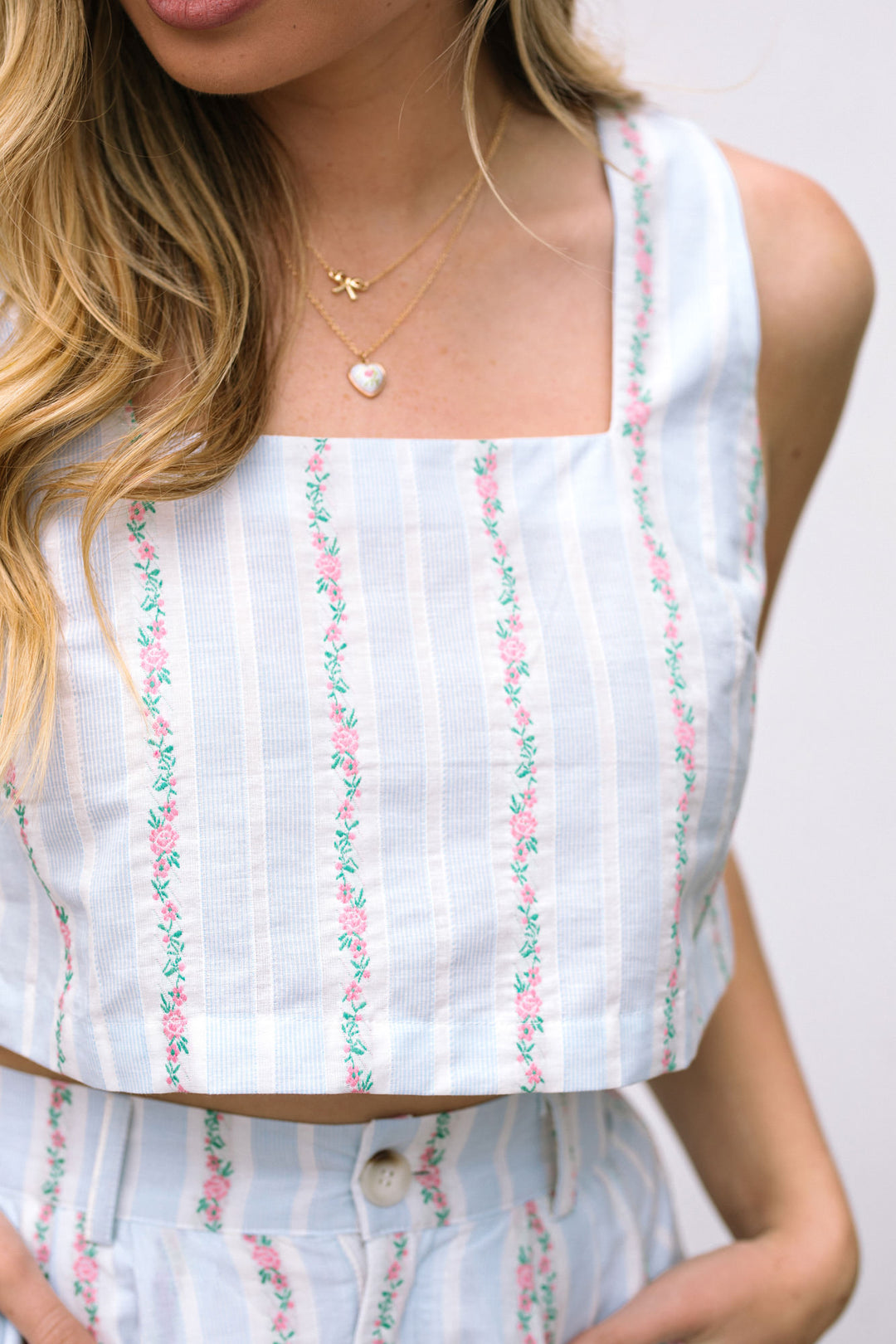 Sleeveless white tank top with pink and green floral embroidered trim, paired with light blue striped shorts.