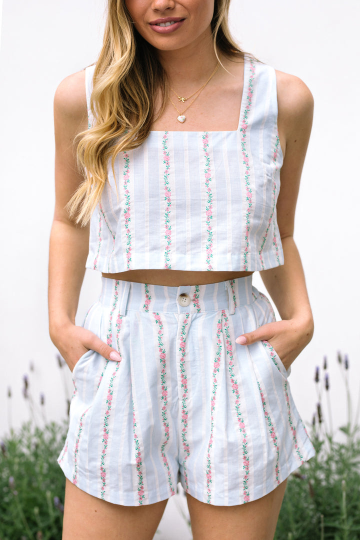 White sleeveless top and floral-printed shorts set, featuring vertical floral stripe pattern and breezy, relaxed silhouette.