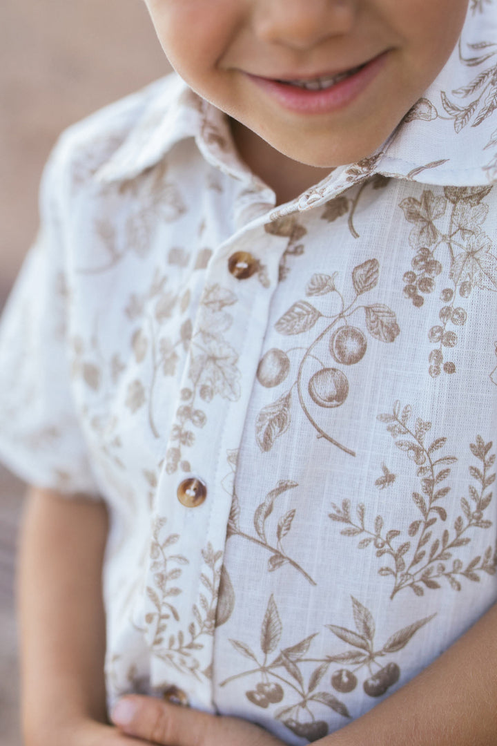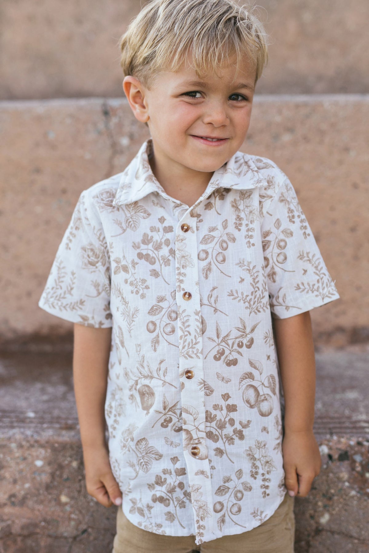 Closeup of a smiling child wearing a white floral button-down shirt with beige leaf and berry patterns.