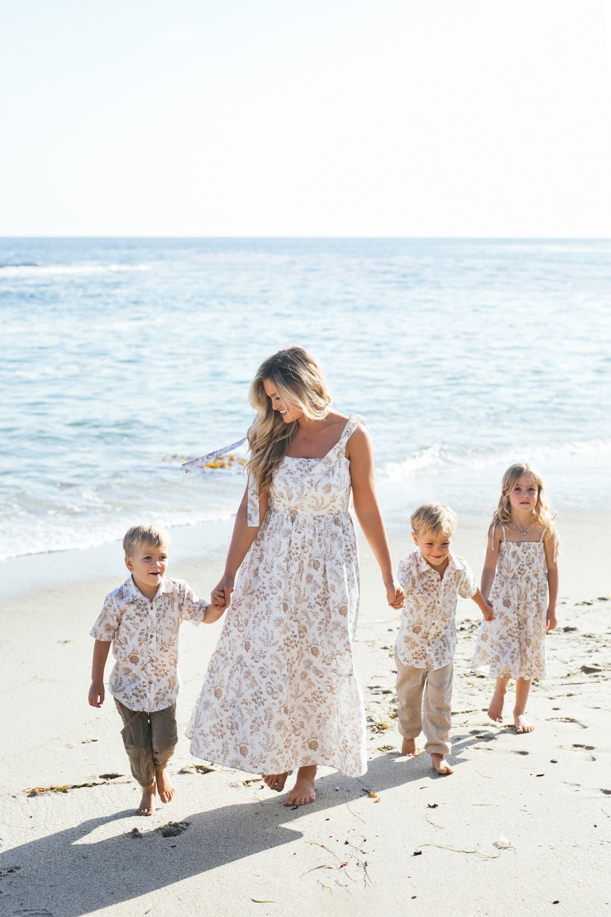 A woman and her three young children walking along a beach, wearing matching floral-patterned clothing against the backdrop of a serene ocean.