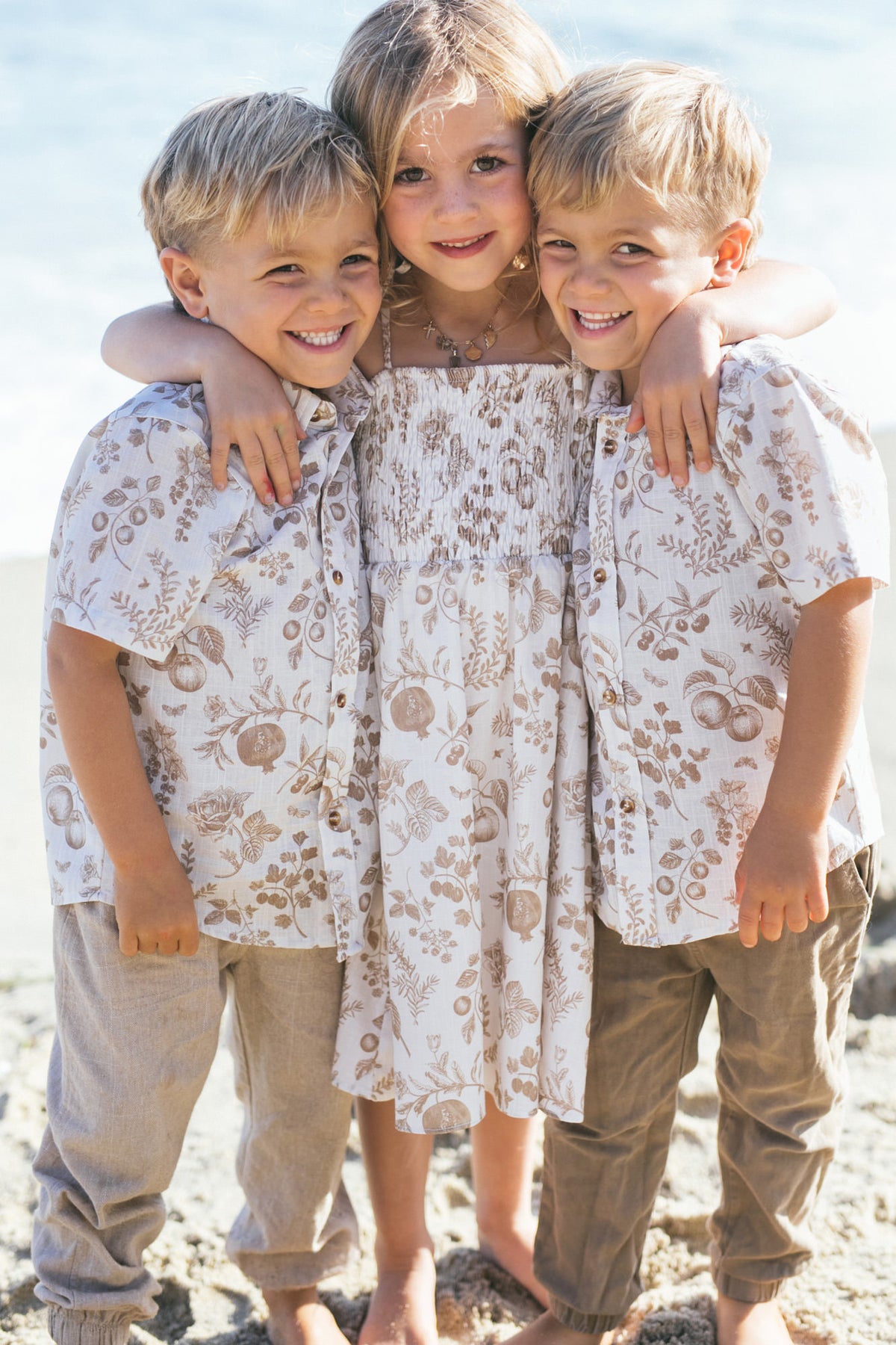 Three smiling children wearing a patterned button-up shirt and casual pants, embracing each other against a beach backdrop.