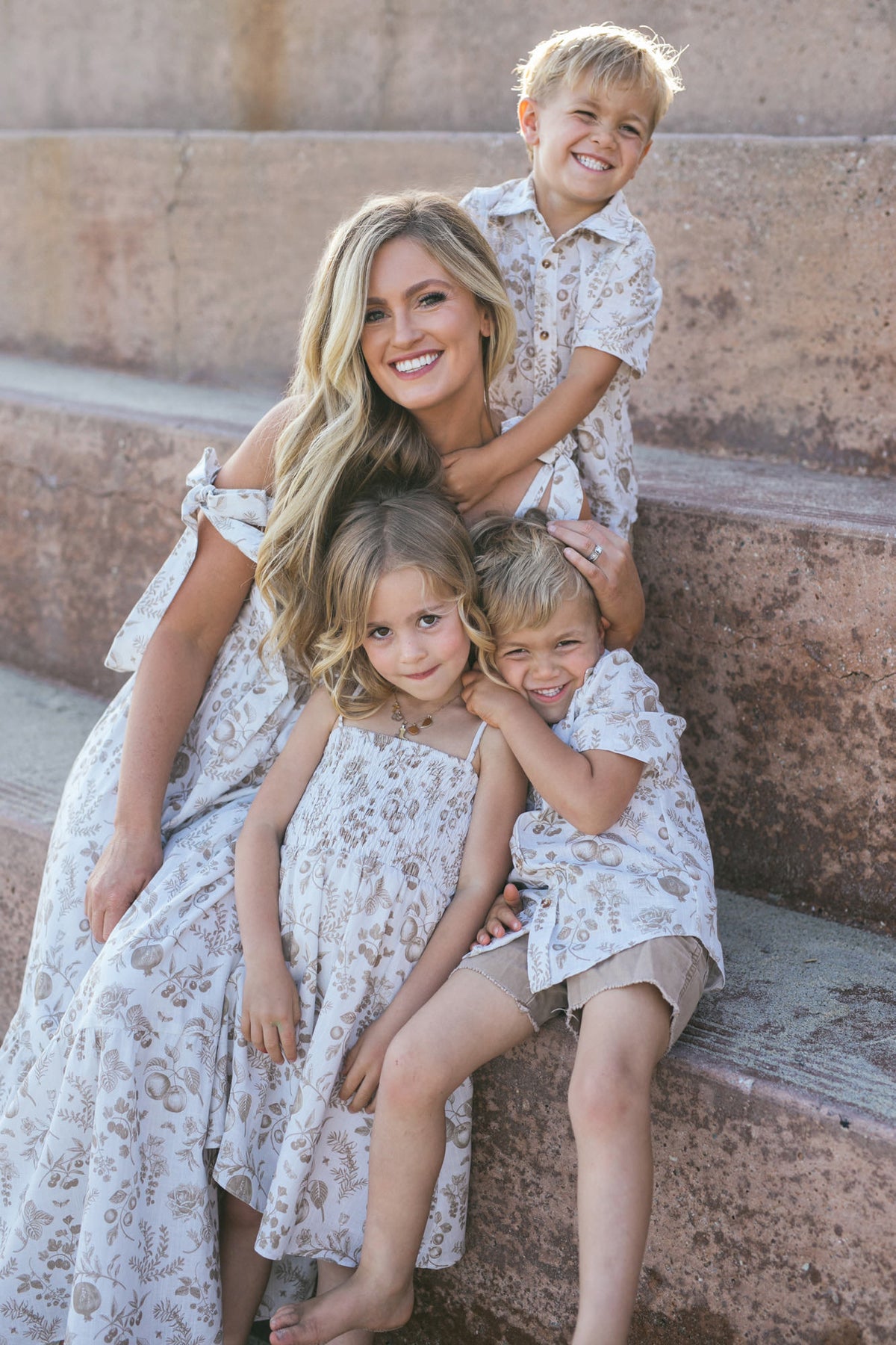 A smiling mother holding her three cheerful children in front of a stone wall, all dressed in matching floral print outfits.