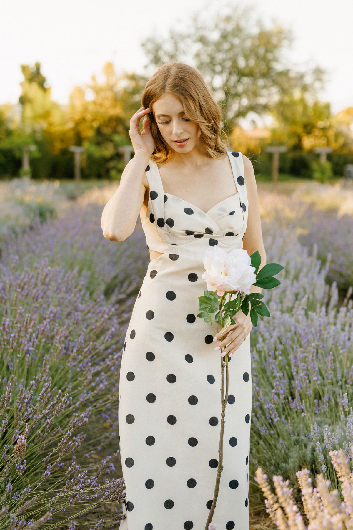 A woman stands in a lavender field wearing a polka dot dress with a fitted bodice, flowing skirt, and thin straps, holding a rose.