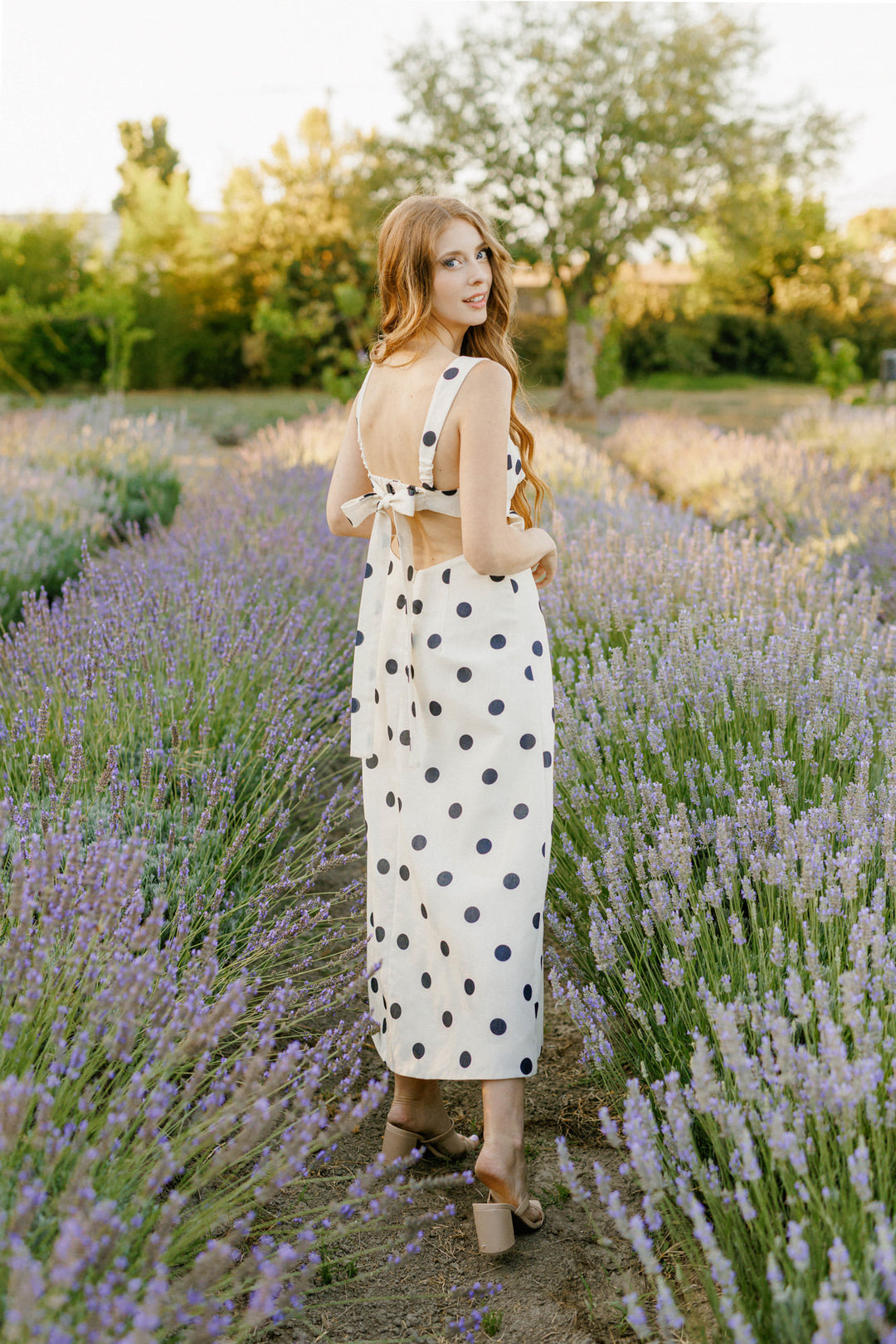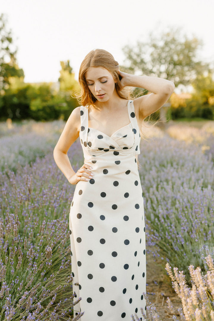 A woman in a long, white dress with black polka dots, posing in a field of lavender. The dress features a tie-front detail and the woman has wavy, auburn hair.