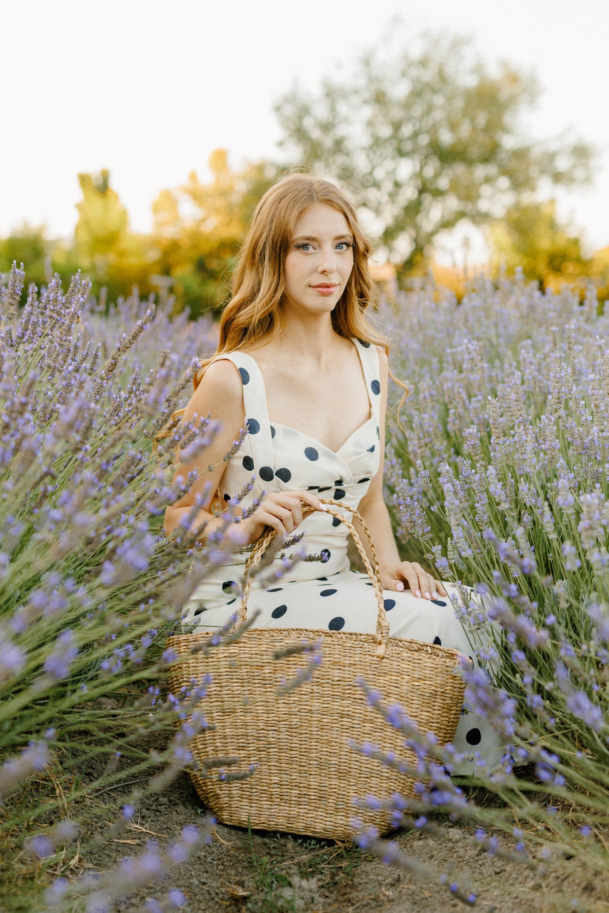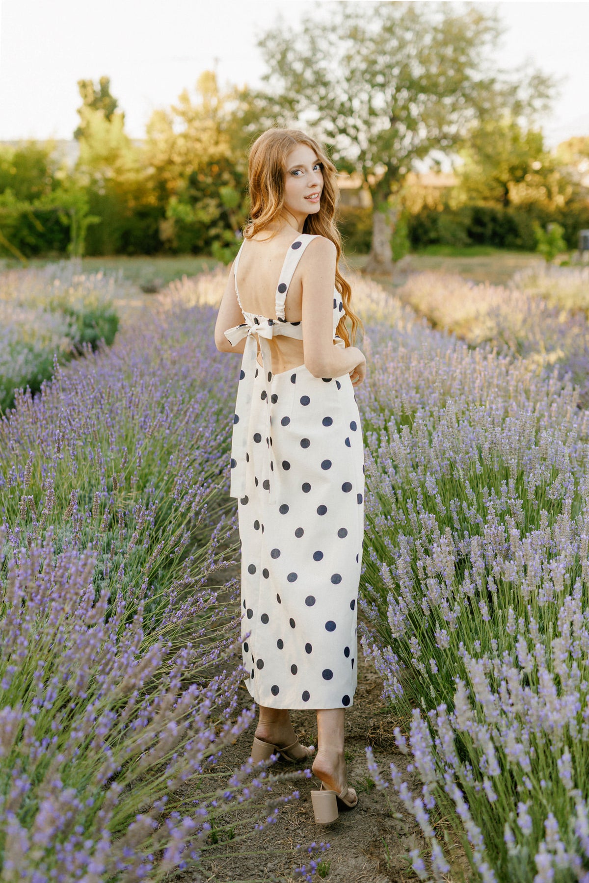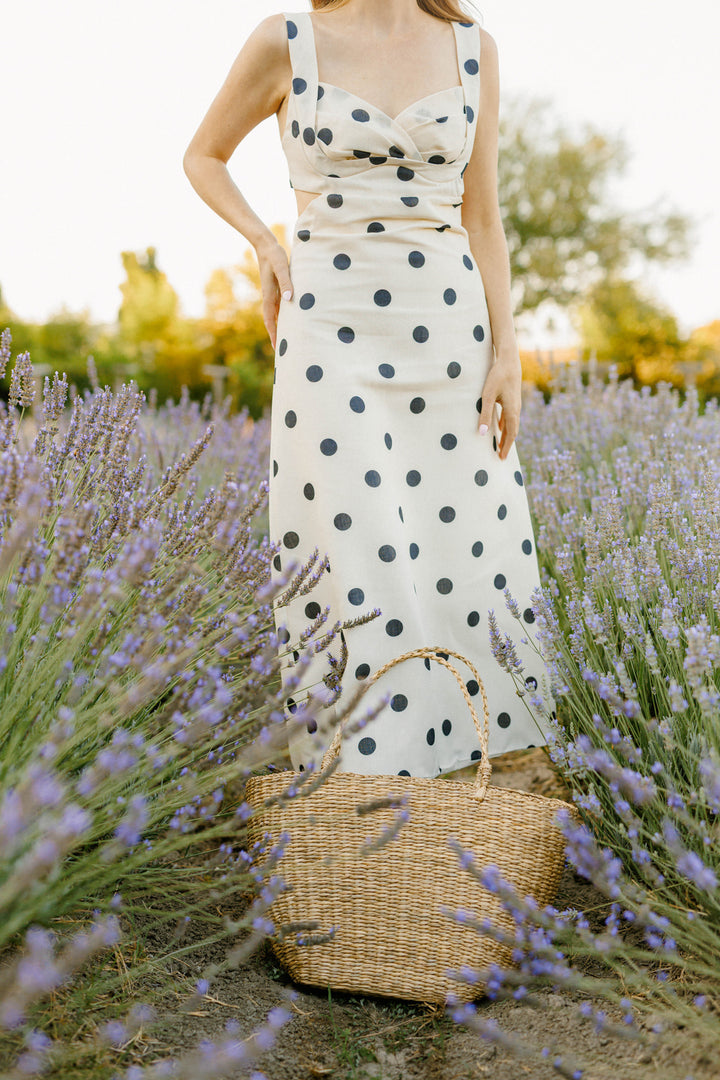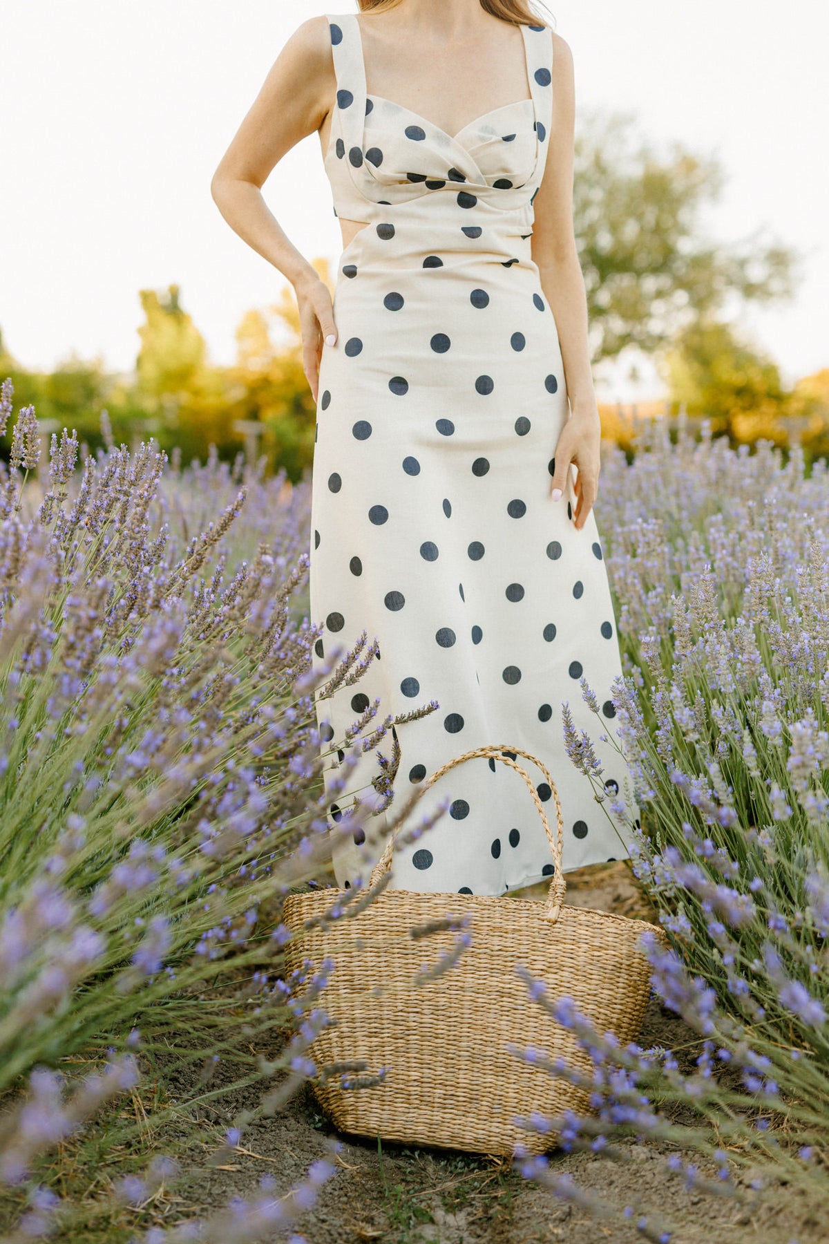 A woman stands in a lavender field wearing a sleeveless, midi-length dress with a white background and navy blue polka dots, holding a woven straw bag.