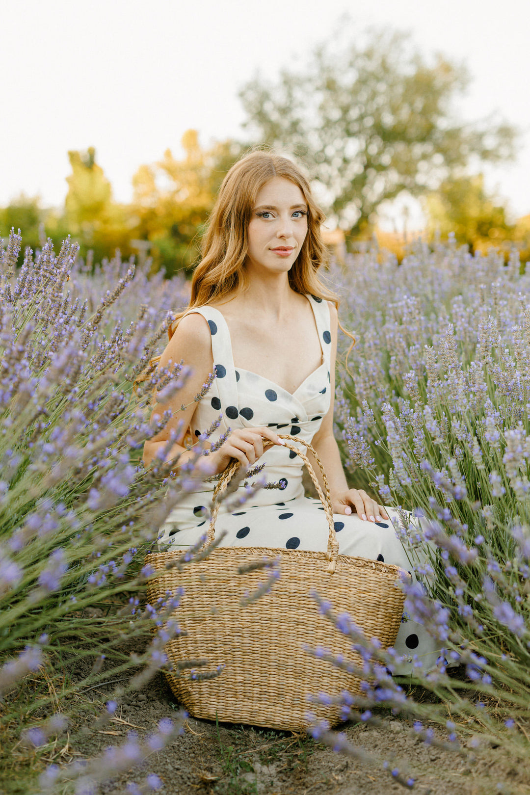 A woman in a white polka dot dress stands in a field of lavender flowers, holding a woven basket, with a serene, natural setting in the background.